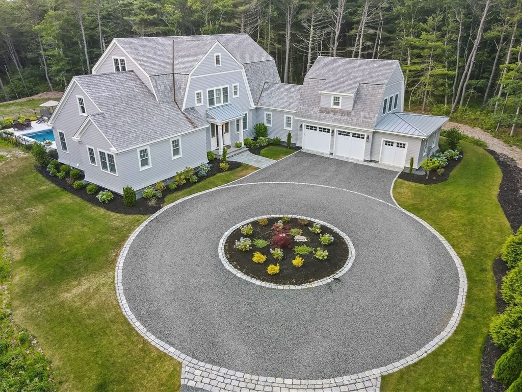 Pamper yourself and your family on this private Cotuit estate with the latest finishes in new construction. This contemporary-style Gambrel home, recalls the best of Cape Cod, was designed for both beauty and function, featuring five-bedroom suites, including the Primary wing. Visible from multiple sliding glass doors and windows in the open floor plan is the salt-generated, heated pool with spa, & Cabana, with a kitchenette, grill area, and bathroom/shower beckoning you out to the private 2.24-acre yard. Or, if you're a beach person, take yourself to your private beach on Nantucket Sound where you can moor your boat. The floor plan flows from the custom kitchen through a dining area to the living room, with a stone surround on the gas fireplace. A wonderful surprise is the 3rd-floor family room with a comfy TV viewing station and a table for games for those stormy days, or long winter nights. A half bath and snack room make it convenient to stay the night.